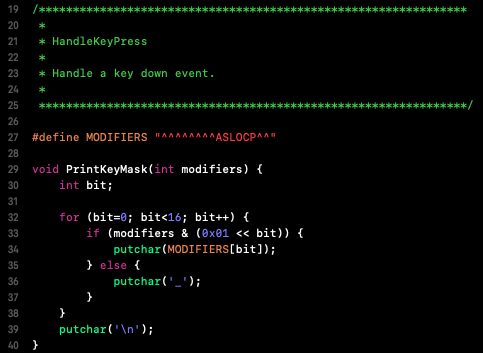 The core of the code is in a main.c file which starts up the tools, waits in a loop for the option key to be pressed, and then shuts down the tools and exits. The details of the functions and the mask of values for GTEReadControl were taken from the GTE Toolbox documentation.